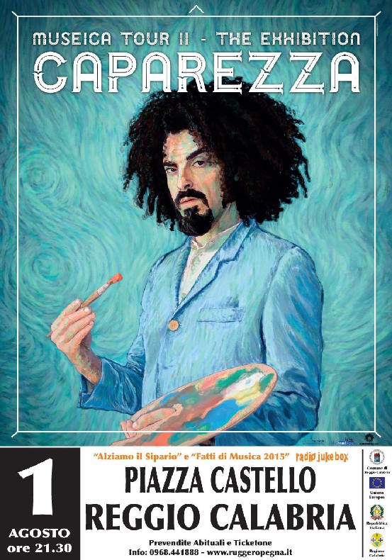 La storica Piazza Castello di Reggio Calabria ha fatto il pieno di pubblico ed entusiasmo con il “Museica II The Exhibition” di Caparezza, lo straordinario concerto-spettacolo che ha radunato migliaia di fan del geniale cantautore pugliese arrivati da tutta la regione. Sotto la splendida cornice del Castello Aragonese, tutti a saltare e ballare per oltre due ore con Michele Salvemini e la sua scatenata band: Rino Corrieri, batteria, Diego Perrone, voce, Gaetano Camporeale, tastiere, Alfredo Ferrero, chitarra, Giovanni Astorino, basso.