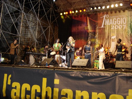 Alle 20.00 in punto ha aperto il concertone la band di casa “La strega del carillon”, applauditissima. E´ poi arrivata l´ italo giapponese Jane Kumada accompagnata da Boon Higashi Noroma al basso e Michele Vurchio alle percussioni. La grande atmosfera della dolcissima cantante dagli occhi a mandorla, che ha incantanto con la sua voce ed il suo pianoforte, ha poi ceduto il posto agli scatenatissimi Dabol, travolgente band napoletana, concentrato di rock-a-muffin, ovvero strano mix di rock, drum´n´bass e ragamuffin, alchimia che spazia tra suoni sintetici e ritmica viva. Dopo gli ospiti di “Sanremo Off” e ben tre ore di musica, hanno chiuso il concertone del Primo Maggio a Lamezia Terme i Yampapaya, band di Afroworldmusic capitanata da David James Hoffman. I musicisti statunitensi, senegalesi, congolesi ed italiani dei Yampapaya hanno fatto esplodere la piazza con suoni e brani multietnici, fusione di ritmi diversi con testi originali in lingua inglese, francese e dialetti africani, tra cui “Lingala” e “Suahili”. I Yampapaya, termine tailandese che significa “Insalata Mista Piccante”, tra ritmi cubani, sudamericani ed anche Zouk, Calipso e Reggae, hanno portato gli oltre diecimila presenti fino alle ventitre circa, quando la kermesse si è conclusa con una straordinaria jam session che ha coinvolto tutti i musicisti della serata, fino ad un autentico trenino che li ha uniti alla folla. Vedere nel giorno della Festa del Lavoro in una regione come la Calabria, in cui l´emergenza occupazione è al primo posto delle priorità, musicisti giapponesi, africani, statunitensi ed italiani, tutti a suonare e cantare insieme, è stato lo spettacolo nello spettacolo, che ha sugellato nel modo migliore il significato internazionale del Primo Maggio, in un mondo ormai senza barriere. L´uomo con il casco da operaio, trasformatosi egli stesso in un punto interrogatiovo rovesciato, al centro della scenografia, tra la data della strage di Portella della Ginestra ed il mappamondo, ha fatto da emblematica cornice scenografica alla musica. La “Festa del Lavoro” anche a Lamezia Terme, terza città della Calabria, baricentro dell´estremo Sud e città al centro di un forte desiderio di riscatto e sviluppo, ha davvero trasmesso con le sue immagini un forte messaggio di speranza. “Perchè – come ha sottolineato il sindaco della Città nel suo intervento – anche e soprattutto attraverso la musica si può parlare di occupazione e di problematiche giovanili, trasmettendo allo stesso tempo un forte messaggio di pace.” Ulteriori informazioni, foto e videoclip del concertone ai siti www.demo.rai.it e www.ruggeropegna.it.