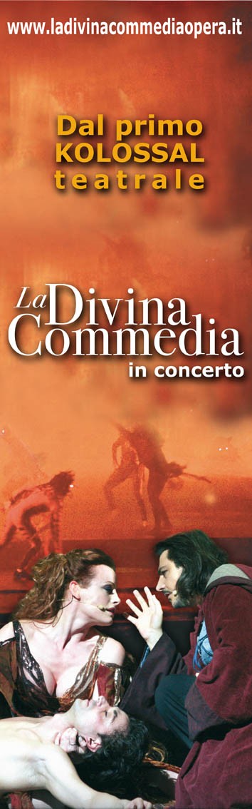 Si è trattato di un vero concerto con i temi principali dell´Opera, accompagnato da suggestive grandi proiezioni. Uno schermo di ben diciassette metri per otto di altezza ha fatto da sfondo al bravissimo Vittorio Matteucci nel ruolo di Dante, Stefania Fratepietro in quello di Beatrice ed ancora Manuela Zanier, bellissima Francesca, Lalo Cibelli nei panni di Virgilio, Alberto Lupo Janelli in quelli di Ulisse ed a tutti gli altri cantanti-attori durante l´esecuzione dei vari brani originali, da “Dialogo con Caronte” ad “Aria di Francesca”, fino all´ “Amor che move il sole e le altre stelle”. Sul palcoscenico anche una parte del gruppo di ballo dell´Opera composto da dieci ballerini-acrobati che hanno ripreso alcune delle magiche coreografie della straordinaria versione kolossal teatrale.