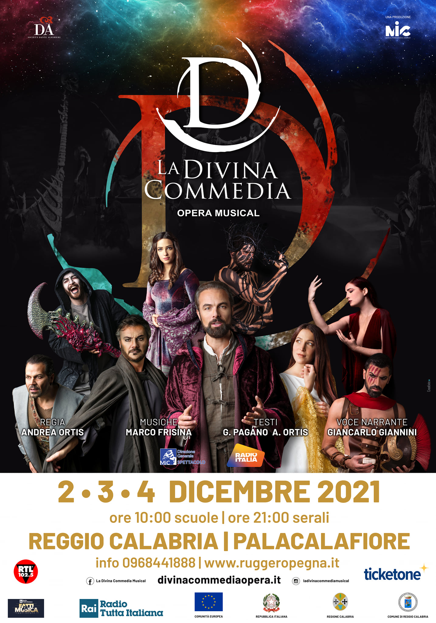 LA DIVINA COMMEDIA MUSICAL il colossal originale con le musiche di Marco Frisina, la regia di Andrea Ortis, le scene di Lara Carissimi e il suo super cast, tornerà in Calabria nei giorni 3 e 4 dicembre 2021 al Palacalafiore di Reggio (ore 21:00 serali; ore 10:00 scuole)!