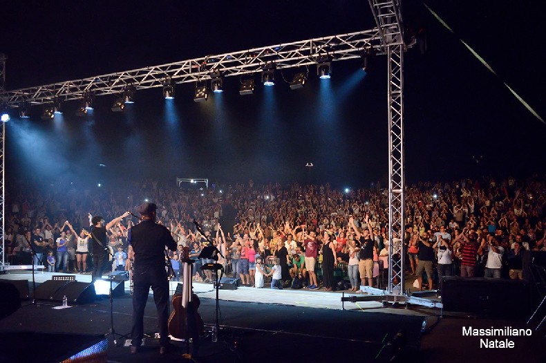 Immagini trasmesse da giganteschi ledwall ed effetti luci da megalive, hanno fatto da cornice ad un concerto travolgente. Oltre due ore di brani ormai celebri, una vera sequenza di super hit, hanno trasformato Il Teatro dei Ruderi in una polveriera di allegria ed entusiasmo. Autentico delirio collettivo ha contagiato tutti al ritmo di brani senza tempo, capaci di unire il numerosissimo pubblico in un grande, unico coro. Una festa live di suoni, emozioni e colori. Onde di mani alzate, hanno accompagnato successi come “Una musica può fare”, del lontano Sanremo ’99, “La Favola di Adamo ed Eva”, “Sotto casa” ed ancora i nuovissimi “La vita com’è”, “Mille volte ancora”, “Ti sembra normale”. Brani popolarissimi, che hanno centrato il successo anche all’estero, dalla Francia al Regno Unito e, in particolare, in Spagna, grazie a sonorità accattivanti e senza confini.