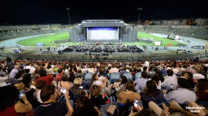 Notre Dame De Paris trionfa anche a Cosenza, dove è arrivata per la prima volta e, peraltro, anche l’ultima in Calabria, visto che il tour si chiuderà a settembre a Verona. Tre serate magiche in uno stadio San Vito/Marulla che, per l’arrivo della celeberrima opera di Riccardo Cocciante prodotta da Clemente e David Zard, ha messo l’abito elegante del teatro sotto le stelle, con un allestimento imponente preparato e costruito in ogni dettaglio da Ruggero Pegna, come al solito impeccabile organizzatore di un altro straordinario evento. Lo stesso promoter, prima del debutto, aveva consegnato a Giò Di Tonno, Quasimodo, il Riccio d’Argento del maestro orafo Gerardo Sacco del suo prestigioso festival “Fatti di Musica” per la “Migliore Produzione di Opera Moderna di sempre”. Riconoscimento meritato e consacrato anche a Cosenza dall’entusiasmo di un pubblico record per uno spettacolo di questo genere, con circa diecimila presenze complessive.