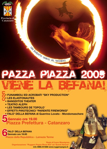 “Pazza Piazza 2009” è un evento spettacolare unico al mondo, ideato ed organizzato dalla Show Net di Ruggero Pegna in collaborazione con Eventi Verona di Ivano Massignan per la Provincia di Catanzaro, che ha incantato e sbalordito con numeri mozzafiato ed effetti speciali da mille e una notte. La storia della Befana è stata costruita attraverso esibizioni funamboliche ed acrobatiche straordinarie, proiezioni architetturali, effetti speciali e pirotecnici, musiche affascinanti, fino al rito apotropaico del falò della gigantesca Befana alta dieci metri costruita dal maestro veneto Guerrino Lovato. Lo show televisivo è iniziato con le incursioni sonore degli artisti del Teatro dell´Aleph e di Les Tambours de Topolò, mentre le immagini dell´Universo, proiettate su tutte le facciate degli edifici e su di una gigantesca palla sistemata davanti al Palazzo della Provincia, hanno immerso il pubblico in un´autentica favola raccontata dalla voce narrante dell´attrice crotonese Giusy Mellace.